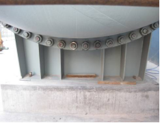 所设计的平台主体结构为卧式筒体,变径设计采用过渡锥壳结构,一端为固定不可拆密封结构,另一端为可拆卸的端盖封头。平台主体圆筒段名义壁厚为38mm,内径3.5m,长7.5m,实物图如图5.2所示。底部封头为内压标准椭圆封头。端盖封头为内压标准椭圆封头,壁厚为44mm,内径2.5m,深度为0.625m,直边高度为40mm,实物图如图5.6所示。端盖封头与筒体采用法兰连接形式,设计为窄面整体法兰,材料为16Mn。窄面法兰螺栓布置,共有72个公称直径为48mm的螺栓,其材质为35CrMoA,实物图如下图所示。平台为卧式容器,采用双鞍式支座,选用A型轻型固定式鞍座,材料选用与圆筒材料相同为Q345R,工作温度范围0~250℃。鞍座与圆筒相连接的垫板与圆筒材料相同为Q345R.